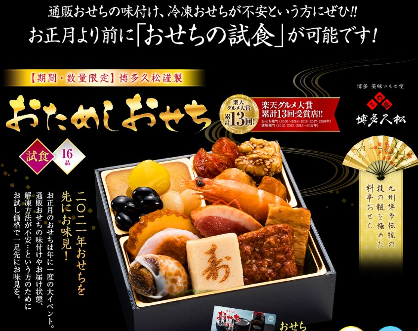 具体的には「おせち部門」で、2006年・2007年・2008年・2009年・2010年・2011年・2012年・2013年・2014年・2016年・2017年・2019年の合計12回「楽天グルメ大賞」を受賞したお店です。