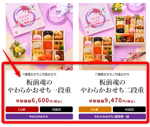 「柔らかおせち」と「普通のおせち」が一緒になって、2段重箱になっているラインナップもあるので、1つの注文で家族で楽しめます。