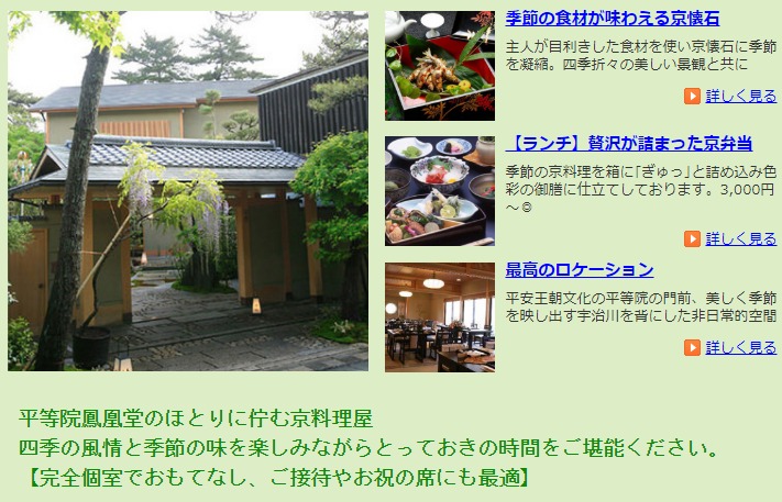 宇治川のほとりにあり、春は桜、秋は紅葉を眺めながら食事が楽しめるとあって、観光客も多く訪れる。京料理を極める一方で、日本料理アカデミーの一員として、フランス人シェフとワークショップを開催するなど、食文化の交流にも努めている。